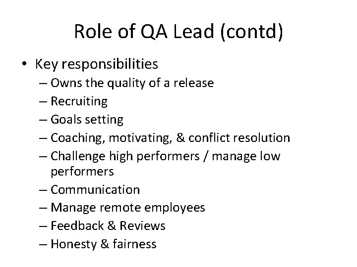 Roles and Responsibilities of a QA September 19 2019 The role of a QA leader is that of supervising the testing activities of a software system under the scanner. He has to ensure that his team of QA engineers are on the right track all the way in the project resolving conflicts across the team review the schedules and plans mitigation of the risks checking quality in phases update management build a challenging and motivating environment. At this point there are only other areas of activity a person can discover if they dont plan to stop the career growth.