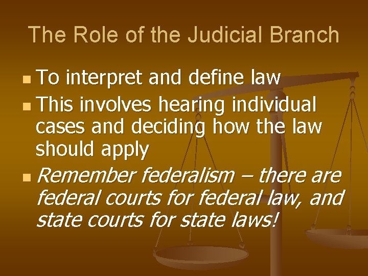 The judiciary is the branch of the federal government that decides cases under the nations laws. The Roles and the Responsibilities of the Judicial Branch. What are the two main roles of the judicial branch.